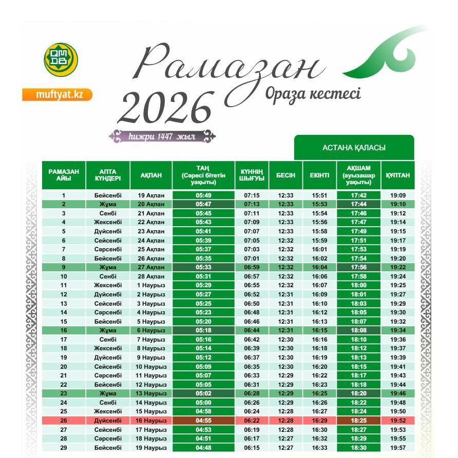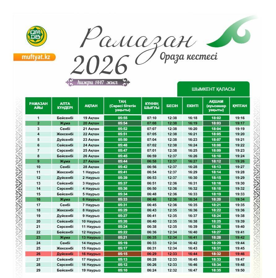 «Учитывая результаты научных исследований и решение Совета по фетвам при Совете муфтиев Организации тюркских государств, мы приняли общее решение. Если на то будет воля Аллаха, в этом году месяц Рамазан начнётся 19 февраля. А ночь с 16 на 17 марта — священная Ночь предопределения (Ляйлятуль-кадр). 20 марта — праздник Ораза айт», — сказал Наурызбай кажы Таганулы.