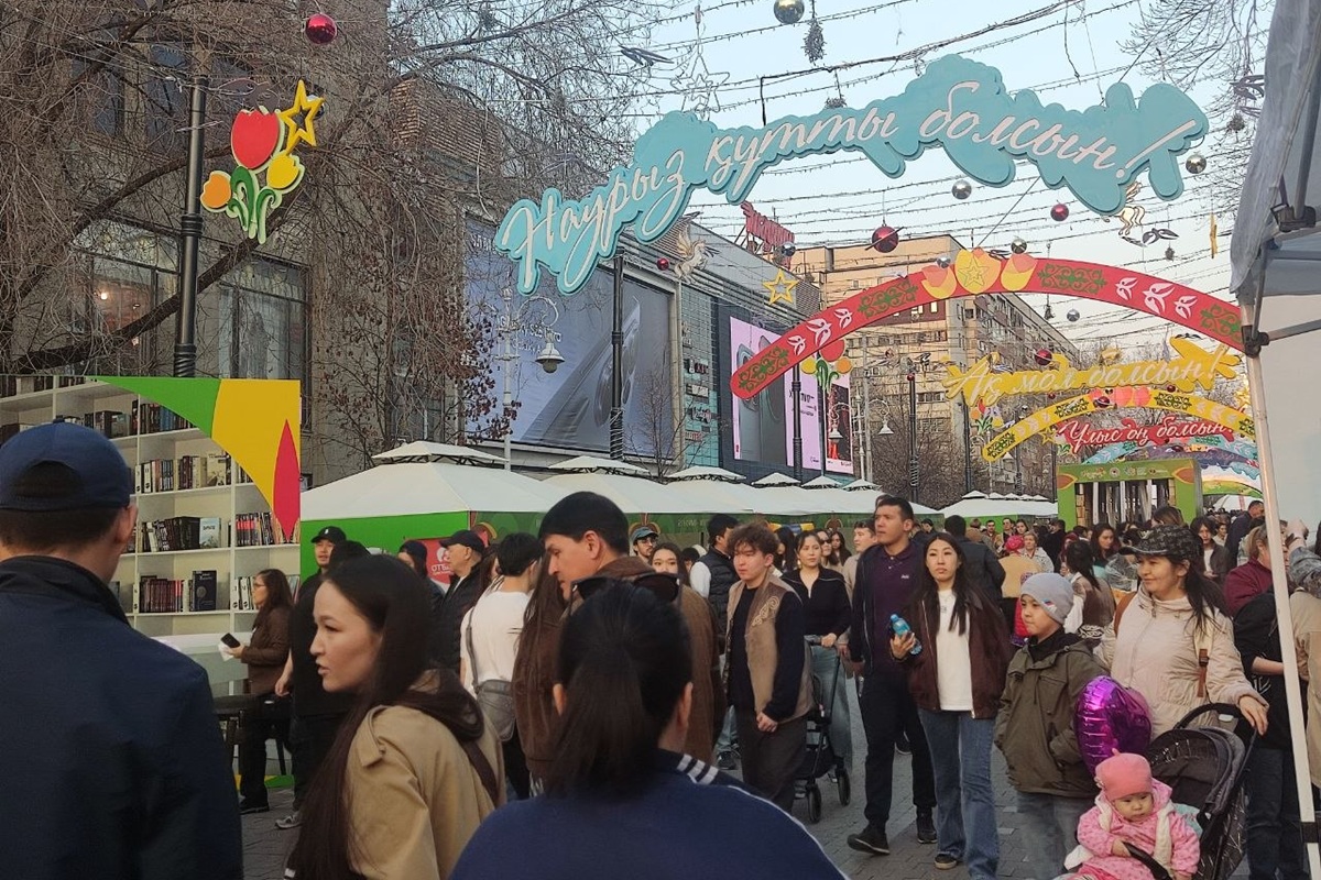 На фоне надписей и праздничных декораций, гирлянд и городских вывесок формировалась общая атмосфера Наурыза — открытая, живая и насыщенная.